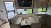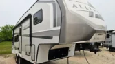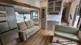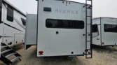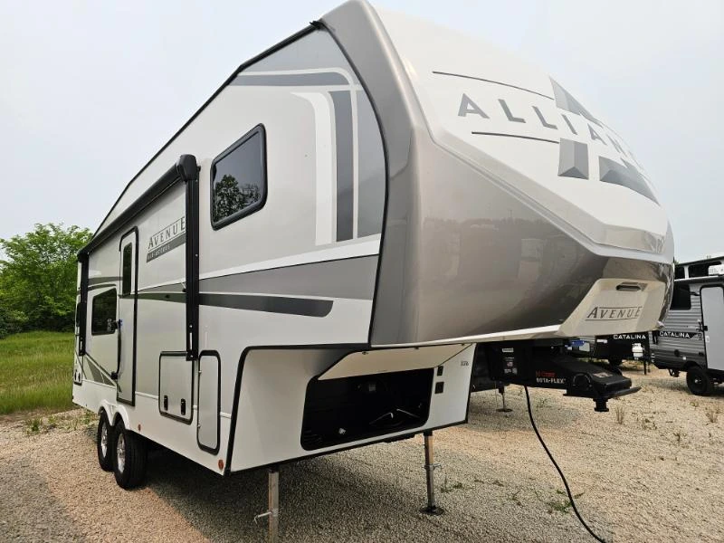 The Avenue All Access Series is a mid-profile fifth wheel designed for comfort and practicality. Its living spaces include LED-lit awnings, solid entry steps, and atrium windows for cross ventilation. Interiors feature smart LED dimmer switches, accent lighting, blackout roller shades, and hidden storage compartments. Entertainment is centered around a fireplace space heater, large HDTV on a swing mount, and optional theater seating. Seating options include sofa sleepers, recliners, and ottomans with hidden storage. Dining areas provide solid surface countertops, a backsplash, and pantry storage. Appliances include a 10cf 12V refrigerator, range with oven, and residential microwave. Electronics are managed through a systems center with multiple charging stations. Sleeping quarters feature a queen bed, overhead storage, nightstands, closet space, and washer/dryer prep. Bathrooms include medicine cabinets, vanities, showers, and porcelain toilets. Mechanicals include dual LP bottles, 13.5K AC with prep for a second, and a 35K forced-air furnace. Heated tanks with 12V pads and PEX plumbing ensure year-round usability. The coach build uses a Benchmark chassis, MORryde suspension, Dexter axles, and Goodyear Endurance tires. Construction highlights include Azdel composite sidewalls, high-gloss finish, painted front cap, and PVC solar-reflective roofing. Exterior durability is supported by a walk-on roof deck, enclosed heated underbelly, flush slideout floors, and slam-latch cargo doors.