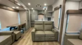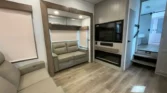 The Alliance RV Paradigm is designed to combine comfort, technology, and durability for modern RV living. Its living spaces include patio awning LED lighting, quad strut assist solid entry steps, and Congoleum flooring. Atrium windows with MCD roller shades provide natural light and privacy. A tri-fold sofa hide-a-bed, entertainment center, and fireplace space heater create a cozy atmosphere. Hardwood cabinetry with hidden hinges and soft-close catches adds a residential touch. The kitchen features…
