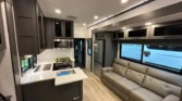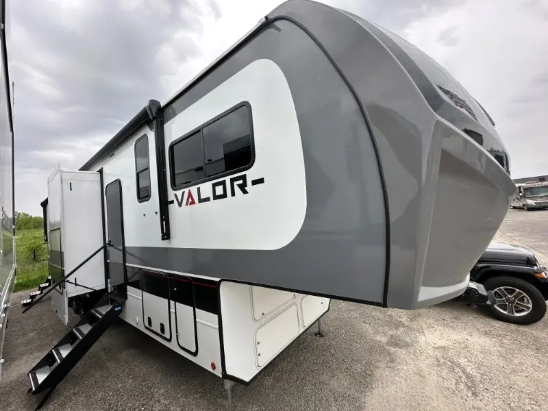 The Alliance RV Valor Toy Hauler is built for performance, versatility, and comfort. Its garage includes an 8-foot weather-resistant ramp door, pull-down screen, and insulated flooring. Dedicated garage heat and AC, plus a 12V TV, make the space livable year-round. HappiJac rollover sofas and L-track tie-downs provide flexible cargo and seating options. Onboard systems include an air compressor and dual 30-gallon fuel tanks for extended trips. Living spaces feature adjustable Solera awnings with…