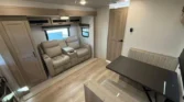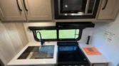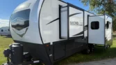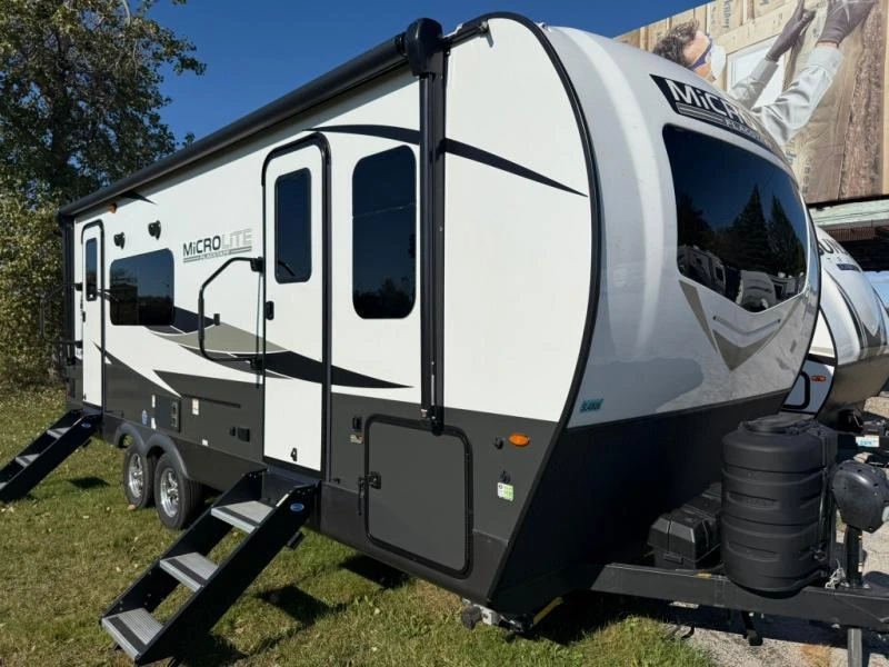 The Flagstaff Micro Lite is a lightweight travel trailer designed for versatility and comfort. Its living spaces include a power awning with adjustable rain dump and LED lighting, solid fold-out entry steps, and keyed-alike locks. Entry is enhanced by friction hinge doors, foldable handles, and a pet-friendly screen door closer. Interiors feature 12V LED ceiling lights, an automotive-style windshield, and tinted frameless windows. Night roller shades and Sedona wood cabinetry add warmth and privacy. Dining areas include aluminum cage dinette bases, solid surface countertops, and undermount sinks with covers. Appliances include a 12V refrigerator, 3-burner cooktop with flush glass cover, 21-inch oven, and microwave. Outdoor cooking options are available depending on the model. Electronics include a systems center, OneControl monitor panel, WiFi WeRV app, and rear observation camera prep. Connectivity is supported by TST tire pressure monitoring, cable/satellite hookups, and an AIR 360+ antenna. Entertainment includes a 12V Smart TV, stereo system, and outdoor speakers. Sleeping quarters feature queen or Murphy beds, overbed storage, wardrobes, and aluminum cage bed bases. Bathrooms include medicine cabinets, vanities, skylights, Showermiser water-saving systems, and porcelain foot-flush toilets. Mechanicals include a 200W solar panel, 1800W inverter, dual LP bottles, and a 55-amp converter charger. Climate control is supported by a 15K ducted AC and optional 20K or 35K furnace. The coach build uses torsion axles, Dexter Nev-R-Adjust brakes, Goodyear Endurance tires, and polished alloy wheels. Construction highlights include six-sided aluminum framing, composite sidewalls, vaulted ceilings, and radiant foil insulated underbellies.