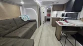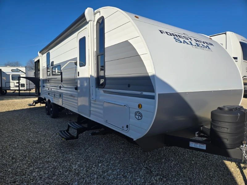 The Salem Cruise Lite is a lightweight travel trailer designed with the Best in Class package for convenience and comfort. Its living spaces include adjustable awnings with LED blade lighting, StepAbove entry steps, and keyed-alike locks. Interiors feature dimmable LED blade lights, textured roller shades, and designer window treatments. Storage solutions include Stow N Go compartments, Versa furniture, floating shelves, and overhead cabinets with heavy-duty hinges. Entertainment is centered around an entertainment center, TV prep bracket, JBL stereo, and optional fireplace space heater. Dining areas offer booth seating or pull-out tables with chairs, depending on model. The kitchen includes seamless countertops, designer backsplash, high-rise faucet, and galley window. Appliances include a refrigerator, Versa-range, range hood, and microwave, with outdoor cooking options available. Sleeping quarters feature a custom Versa-Tilt bed, overbed storage, laundry hamper, closet space, and optional pet step bunk beds. Bathrooms include backlit arched mirrors, shower surrounds, and toilets. Electronics are managed through a systems control center with backup camera prep and outdoor TV bracket. Mechanicals include roof solar prep, battery disconnect switch, 30-amp service cord, and tankless hot water. Climate control is supported by a 13.5K AC unit. The optional Platinum Package adds fiberglass exterior, 200W solar panel, and 30-amp solar controller. The coach build uses a powder-coated I-beam frame, cambered chassis, and aluminum siding. Construction highlights include diamond plate rock guard, removable underbelly panels, stabilizer jacks, and pass-through storage.
