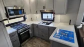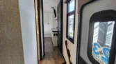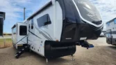 The Jayco North Point is a luxury fifth wheel designed with comfort and advanced technology in mind. Its living spaces include two patio awnings with integrated RGB LEDs, MORryde Step Above entry steps, and an XL grab handle. Vinyl flooring runs throughout, complemented by LED lighting and slideout accent lights. Frameless dark-tint safety glass windows with privacy roller shades and designer treatments enhance style and efficiency. The entertainment center features a fireplace space heater, theater seating, and a 50-inch 4K Smart HDTV. Seating includes TV up-down control, tri-fold sofa sleeper, and optional ceiling fan. The kitchen offers solid surface countertops, a stainless steel sink with glass rinse, and a residential pull-out faucet. Appliances include a 21cf GE refrigerator with inverter, GE Profile range, convection microwave with air fryer, and outdoor JayPort cooking system. Dining is supported by a free-standing table with four chairs and pantry shelving. Electronics are managed through the JAYCOMMAND Smart RV system with JayVoice voice controls. Additional systems include backup and side camera prep, tire pressure monitoring, 5G WiFi extender, and JBL soundbar with wireless subwoofer. Sleeping quarters feature a residential king bed, quilted bedspread, nightstands with cupholders, and a 32-inch Smart TV. Storage includes underbed compartments with gas struts, walk-in closet, laundry hamper, and washer/dryer prep. Bathrooms provide LED backlit mirrors, vanity sink, linen storage, walk-in shower with teak seat, and porcelain toilet. Mechanicals include roof and ground solar prep, three LP bottles, 50-amp service, and a high-output furnace. Climate control is supported by whisper-quiet AC units in living and bedroom, with prep for a third. The coach build uses a steel I-beam frame, MORryde suspension, Dexter axles, and H-rated Uniroyal tires. Construction highlights include vacu-bond laminated walls, high-gloss fiberglass, Magnum Truss XL6 roof system, and seamless Alpha roof membrane. Exterior features include LED lighting, roof ladder, heated underbelly, pass-through storage, and 6-point hydraulic auto leveling.