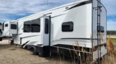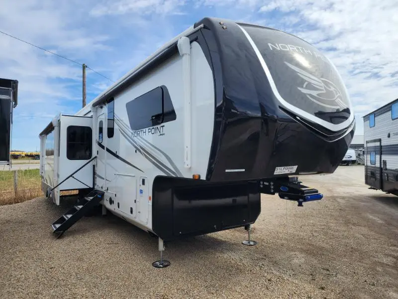 The Jayco North Point is a luxury fifth wheel designed with comfort and advanced technology in mind. Its living spaces include two patio awnings with integrated RGB LEDs, MORryde Step Above entry steps, and an XL grab handle. Vinyl flooring runs throughout, complemented by LED lighting and slideout accent lights. Frameless dark-tint safety glass windows with privacy roller shades and designer treatments enhance style and efficiency. The entertainment center features a fireplace space…