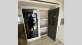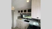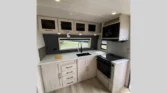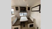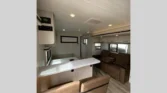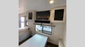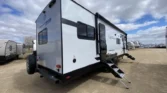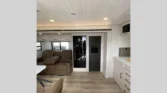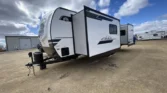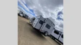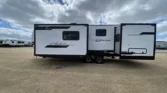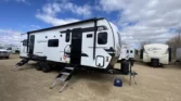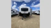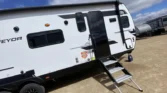 The Grand Surveyor is designed with turnkey camp essentials and premium packages for full-time RV living. Its living spaces include a power patio awning with LED strip, pet leash tether, and lighted adjustable entry steps. Entry is enhanced by a black glass friction hinge door and large assist handle. Interiors feature carefree linoleum flooring, LED lighting, automotive-style windshield, and dark-tint windows with roller shades. Designer window treatments, overhead cabinets, and a central vacuum system…
