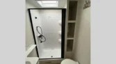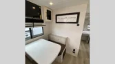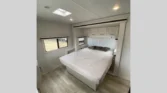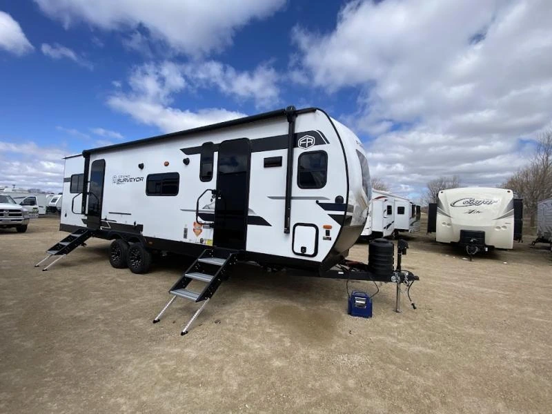 The Grand Surveyor is designed with turnkey camp essentials and premium packages for full-time RV living. Its living spaces include a power patio awning with LED strip, pet leash tether, and lighted adjustable entry steps. Entry is enhanced by a black glass friction hinge door and large assist handle. Interiors feature carefree linoleum flooring, LED lighting, automotive-style windshield, and dark-tint windows with roller shades. Designer window treatments, overhead cabinets, and a central vacuum system add residential convenience. Entertainment includes a fireplace space heater, sofa sleeper, theater seating, and a large HDTV with Bluetooth stereo. Dining areas offer pantry storage, bar stools (varies by model), and Surf(x) seamless countertops. The kitchen includes a black stainless undermount sink, cutting board cover, 10cf 12V refrigerator, cooktop with LED knobs, and microwave oven. Appliances also include a 21-inch gas oven (varies by model) and outdoor cooking options. Sleeping quarters feature a custom king-size bed, overbed storage, upgraded reading lights, nightstands, and washer/dryer prep. Additional storage includes wardrobes, dresser drawers, and underbed compartments with motion lighting. Bathrooms provide vanity mirrors, sinks, linen storage, skylights, porcelain toilets, and slow-close shower doors. Mechanicals include a 200W solar panel, 30-amp controller, inverter prep, 50-amp service, and tankless hot water. Climate control is supported by a 30K ducted furnace, 15K AC with prep for a second, and heated tanks. The coach build uses aluminum cage framing, laminated construction, Azdel composite panels, and block foam insulation. Construction highlights include a walk-on roof deck, seamless PVC roofing, radiant foil insulation, and enclosed underbelly. Exterior durability is ensured with Goodyear tires, aluminum wheels, slam-latch cargo doors, and LED motion lighting in pass-through storage.