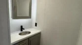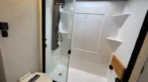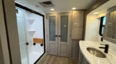 Bathrooms feature solid surface lavatory tops, undermount sinks, fiberglass showers, and porcelain toilets.