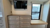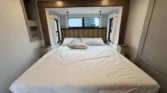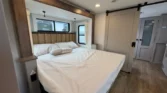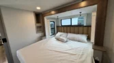The bedroom offers a residential headboard, nightstands, USB charging ports, and underbed storage with gas struts.