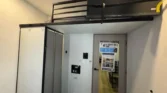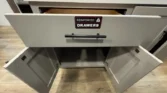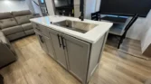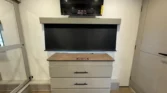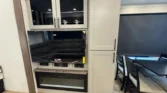 Its garage features an 8‑foot weather‑resistant ramp door, pull‑down screen, and dedicated heat and AC.