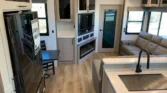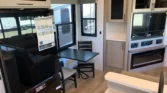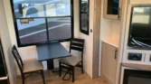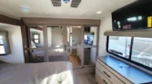 Dining features a flush‑floor kitchen slide, pantry lighting, and solid surface countertops.
