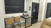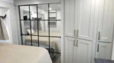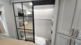 The bedroom offers a king memory foam mattress, underbed drawers, walk‑in closet, and motion‑sensor lighting.