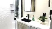 Bathrooms include solid surface vanities, neon shower lighting, multiple shower heads, and porcelain toilets.