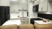 Appliances feature a 19cf refrigerator with ice and water, 4‑burner range, microwave with air fryer, and farmhouse sink.