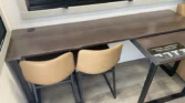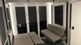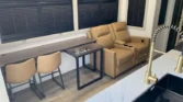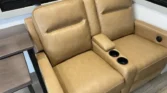 End tables with pop‑up outlets, a fireplace space heater, and integrated shades create a residential feel.