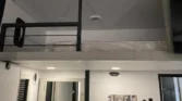 The bedroom offers a king memory foam mattress, underbed drawers, walk‑in closet, and motion‑sensor lighting.