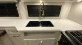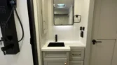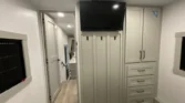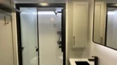 Mechanicals boast solar panels, generator prep, tankless hot water, dual outdoor showers, and six‑point leveling for reliable performance