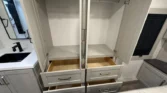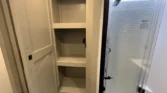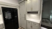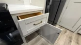A seven‑foot pantry with appliance outlet, dual pullout trash bins, and pet feeder storage add convenience.