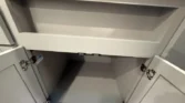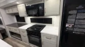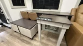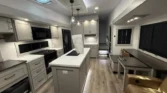 Dining includes a floating or removable table, silverware drawer, and premium cabinetry.