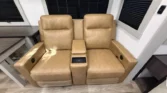 The living area features wall hugger theater seating, tri‑fold sofa, entertainment center, and fireplace space heater.