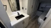 Bathrooms include high ceilings, recessed medicine cabinets, neon shower lighting, and porcelain toilets.