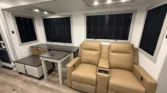 The living area features a tri‑fold sofa sleeper, heated theater seating, entertainment shelf, and 5k fireplace space heater.