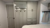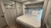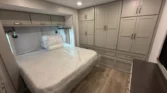 The bedroom offers queen or optional king beds, memory foam mattresses, bedside outlets, and under‑bed storage with felt‑lined trays.