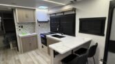 The 22RKHL has a 16’ awning, outside kitchen and XL pass-thru storage with large baggage doors on both sides. It offers LARGE windows facing both sides of your campsite, and a privacy curtain for the front bedroom. Furniture includes a walk-around RV queen bed, booth dinette and theater seating, and a 32” TV & entertainment center! The rear kitchen offers overhead storage AND an extra-deep pantry. The bathroom features a full walk-in shower w/ skylight, porcelain toilet and medicine cabinet.