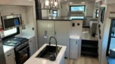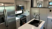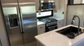 Kitchen amenities include a stainless sink with rinse accessories, GE refrigerator, range, and convection microwave with air fryer.