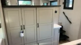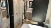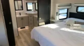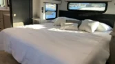 The bedroom offers a residential king bed, quilted bedding, nightstands with cupholders, and hidden dresser storage.