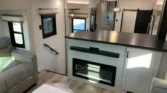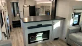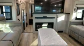 The living area features theater seating with TV lift control, tri‑fold sofa sleeper, and a fireplace space heater.